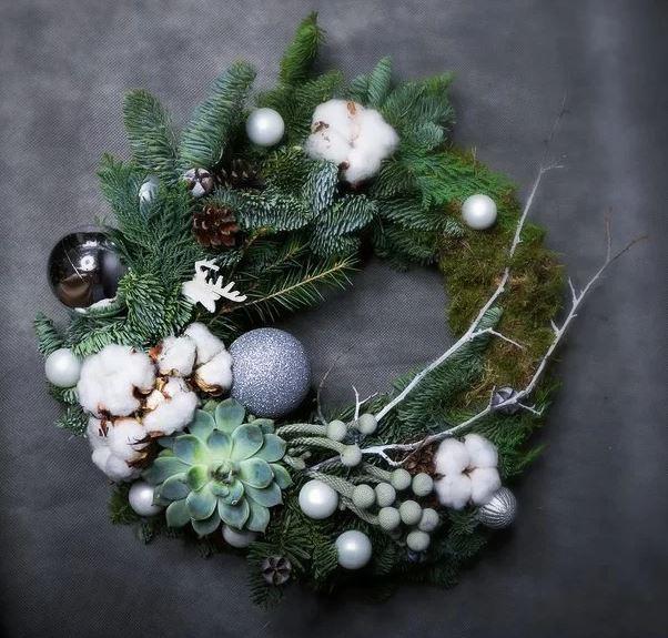Избегайте светящихся гирлянд и мишуры. Всё же офис – это про рабочую атмосферу. Достаточно будет венка из еловых или сосновых лап. Его можно повесить на ресепшене. Или в кабинете руководителя – такой элегантный декор не сбивает пафоса. К тому же венок – не только про красоту, но и про фитонциды: в офисе с неделю будет стоять приятный аромат зимнего леса. Такой новогодний аксессуар можно заказать у флористов. Например, венки делает по каталогу и на заказ известная московская флористическая мастерская «Сады Сальвадора». А у молодой студии «Зверобой. Букеты с лесным характером» можно найти исключительно оригинальные варианты венков, где хвойные ветки будут дополнены… суккулентами, соцветиями лотоса и коробочками хлопка. Можно как купить базовую модель, так и собрать свой вариант под заказ.
