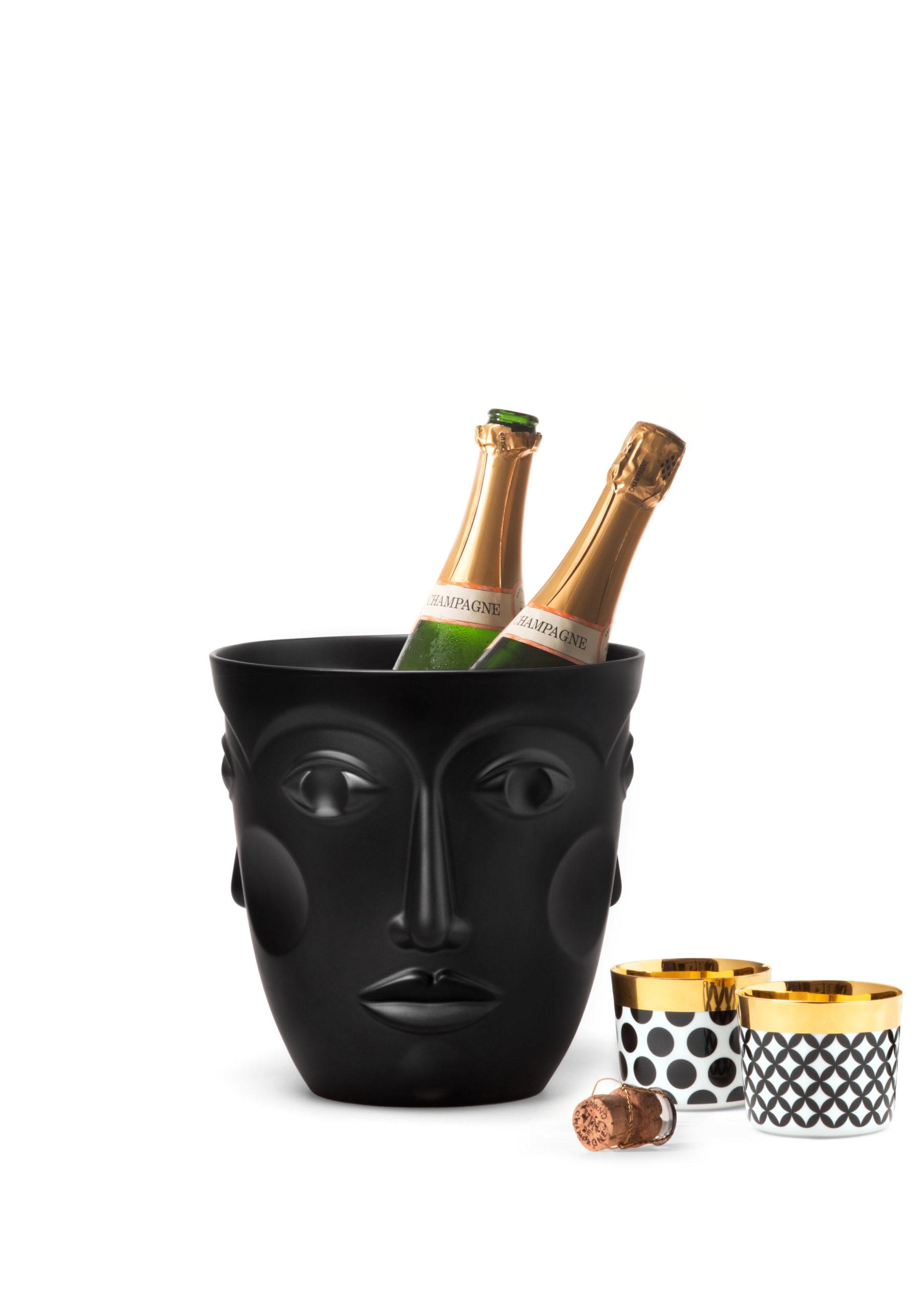 Новогодняя атрибутика тоже может быть небанальной. Совсем не обязательно, например, предлагая партнерам бокал предновогоднего шампанского, брать традиционное увесистое ведро для игристого вина. Такое, знаете, с львиными мордами и сплошь в золоте. Можно найти дизайнерскую модель, вроде той, что предлагает немецкая марка Sieger by Fürstenberg. Ведро для шампанского сделано в виде человеческого лица и напоминает скульптуры модернистов или полотна Пикассо. К нему есть бокалы непривычной нам формы: не флюты и не креманки. В Европе такой полуквадрат называют английским словом goblet, «кубок».
