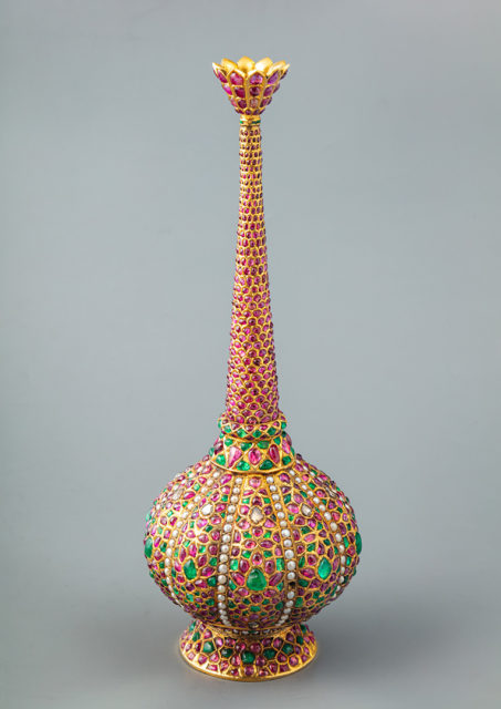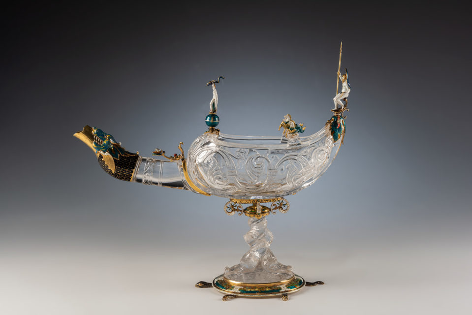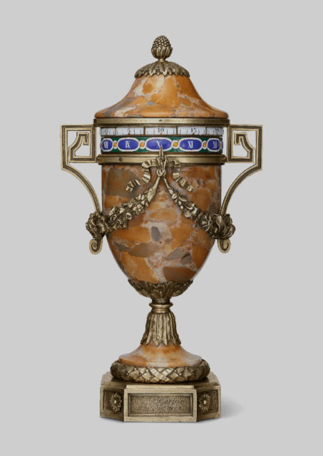 Сама экспозиция небольшая: всего несколько витрин. В каждой из них – один из отреставрированных при поддержке Cartier объектов из коллекции Эрмитажа. Всего их пять, и реставрируют только по одному в год. Каждый из этих объектов сопровождают предметы из исторической коллекции Cartier. Так, к лампе Х века из горного хрусталя подобрали украшения и предметы с использованием того же горного хрусталя. А к кабинету с часами – несколько исторических экземпляров; особенно в этой витрине хороши часы с лавандовой эмалью.