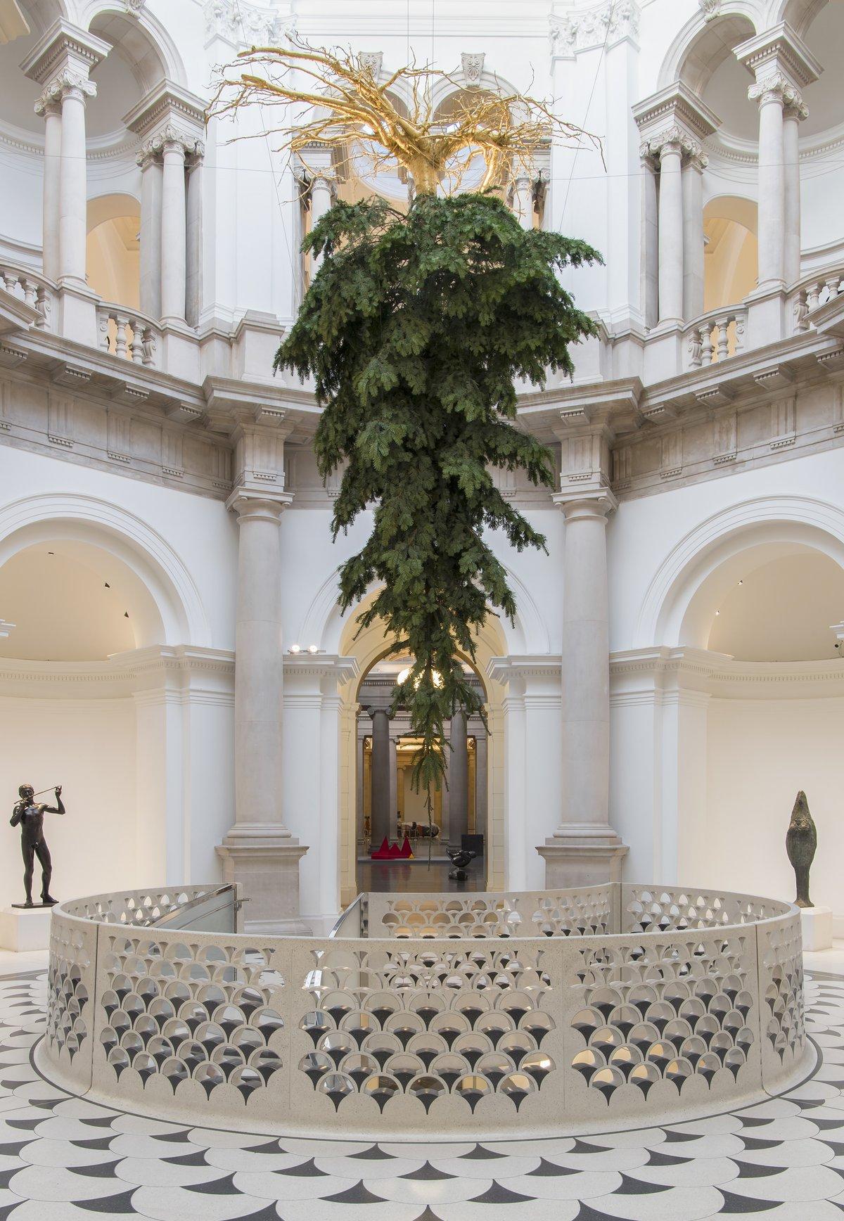 Художница иранского происхождения Ширазе Хушиари тоже ставила елку в Tate. Вернее, она ее подвесила. Мастер инсталляций решила отойти от традиционных представлений о новогоднем декоре и сосредоточилась на естественных качествах дерева – его форме, цвете хвои и ее запахе. Голые ветви свисали над головами посетителей, а вот корень дерева был обращен вверх. Его Хушиари полностью покрыла сусальным золотом. Художнице было важно выделить ту часть дерева, которая обычно скрыта от глаз человека.